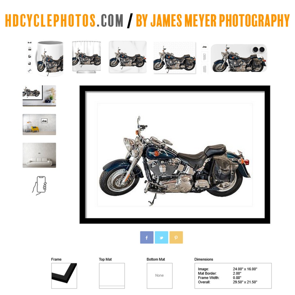4 digital downloads highlighting 3 different views of the motorcycle plus a 11×14 side view Hero print & the Store merchandise link